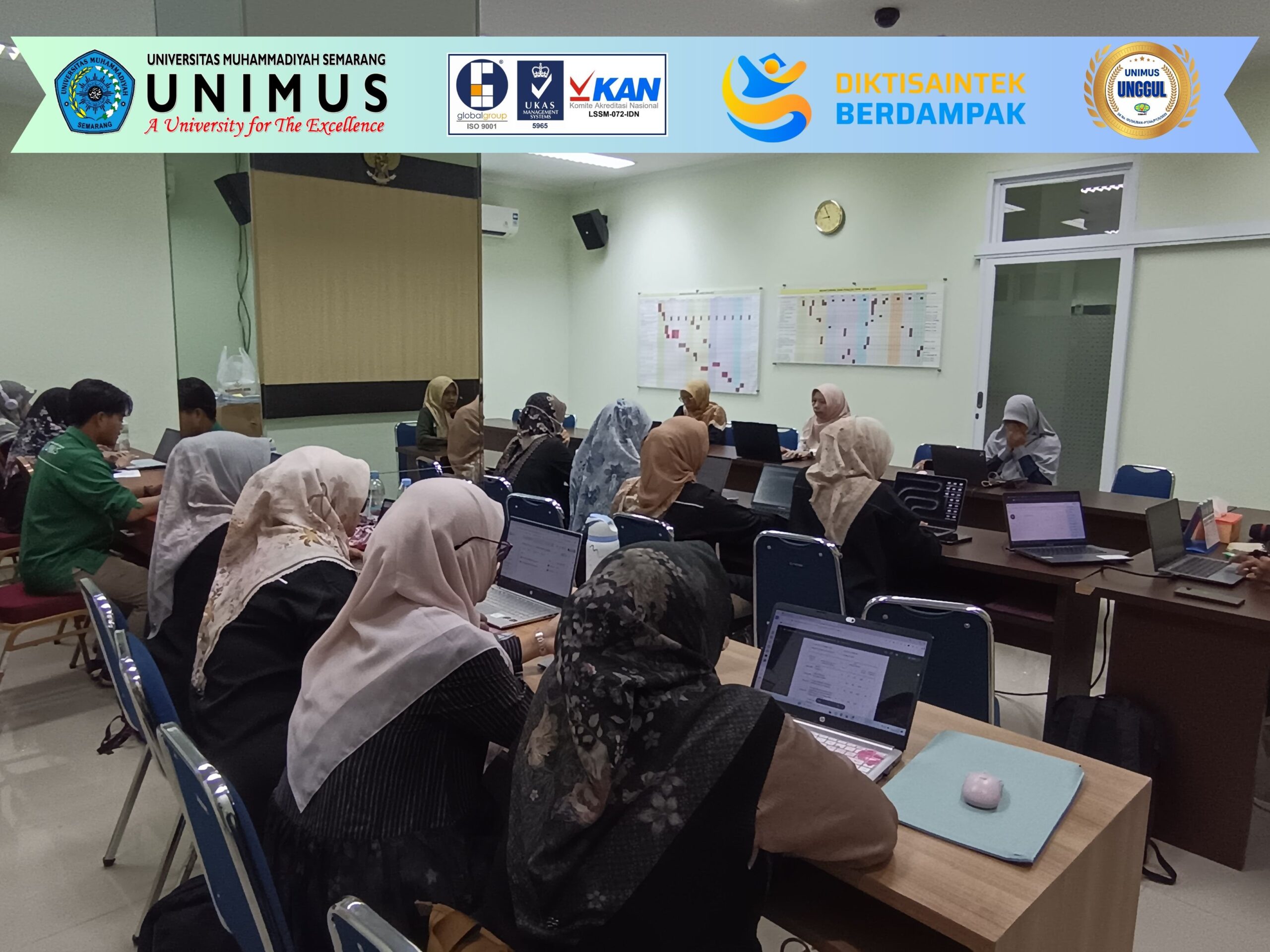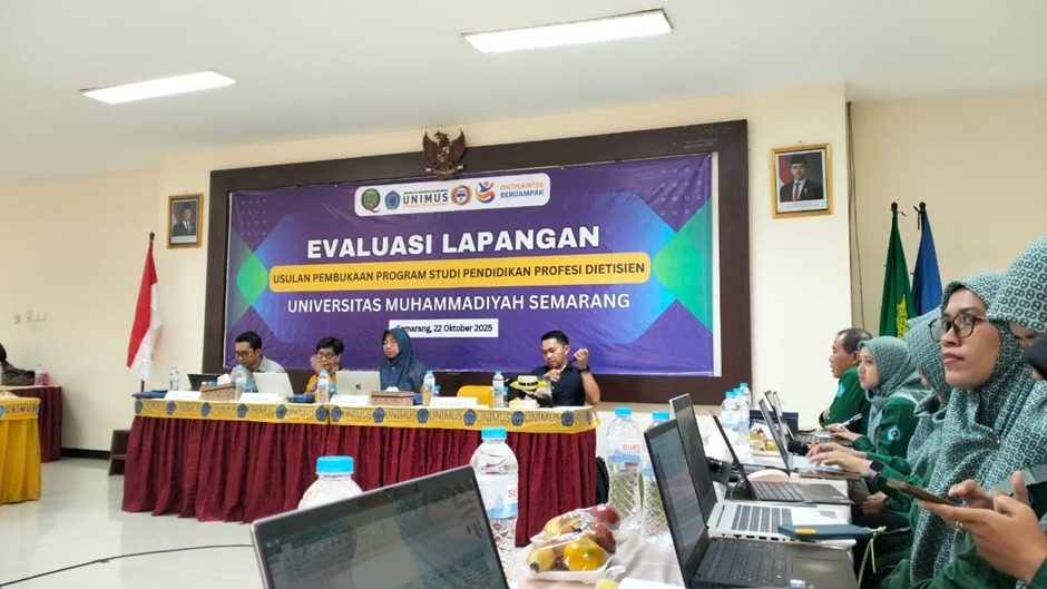 Semarang, 22 Oktober 2025 — Lembaga Pengembangan Pembelajaran dan Penjaminan Mutu (LP3M) Universitas Muhammadiyah Semarang (Unimus) turut mendampingi kegiatan evaluasi lapangan usulan pembukaan Program Studi Pendidikan Profesi Dietisien yang berlangsung pada hari Rabu, 22 Oktober 2025. Kegiatan ini merupakan bagian dari proses penilaian kelayakan pembukaan program studi baru yang dilakukan oleh tim evaluator dari Direktorat Kelembagaan, Direktorat Jenderal Sains dan Teknologi (Kemendiktisaintek). Tim evaluator terdiri atas: Ade Dwi Pradipta, S.AP (Direktorat Kelembagaan) dr. Liliana Sugiharto, MS, PAK (Universitas Katolik Indonesia Atma Jaya) Prof. Dr. Diana Nur Afifah, STP, M.Si Abdul Rosid, S.Kom (Direktorat Kelembagaan) Turut hadir pula Ketua LLDIKTI Wilayah VI Jawa Tengah, Prof. Dr. Ir. Aisyah Endah Palupi, M.Pd., yang memberikan arahan serta dukungan terhadap proses evaluasi lapangan ini. Dalam kegiatan tersebut, tim evaluator melakukan telaah menyeluruh terhadap berbagai aspek kesiapan program studi, mulai dari kurikulum, sumber daya manusia, sarana dan prasarana, hingga sistem penjaminan mutu akademik. LP3M Unimus hadir untuk memastikan seluruh dokumen dan sistem mutu akademik telah sesuai dengan standar yang ditetapkan oleh Kemendikbudristek serta mendukung implementasi pendidikan profesi dietisien yang unggul dan berdaya saing. Ketua LP3M Unimus Dr Amin Samiasih, S.Kp., M.Si.Med menyampaikan bahwa pendampingan ini merupakan bentuk komitmen Unimus dalam menjaga kualitas dan tata kelola akademik yang baik pada setiap proses pembukaan program studi baru. “Kami memastikan bahwa setiap aspek mutu pendidikan telah terpenuhi, agar program studi yang diusulkan dapat memberikan kontribusi nyata dalam peningkatan kompetensi tenaga kesehatan, khususnya di bidang gizi dan dietetik,” ungkapnya. Dengan adanya evaluasi lapangan ini, diharapkan Program Studi Pendidikan Profesi Dietisien Unimus dapat segera memperoleh izin pembukaan dan menjadi bagian dari upaya universitas dalam mencetak tenaga profesional dietisien yang kompeten, beretika, dan berorientasi pada pelayanan kesehatan masyarakat.